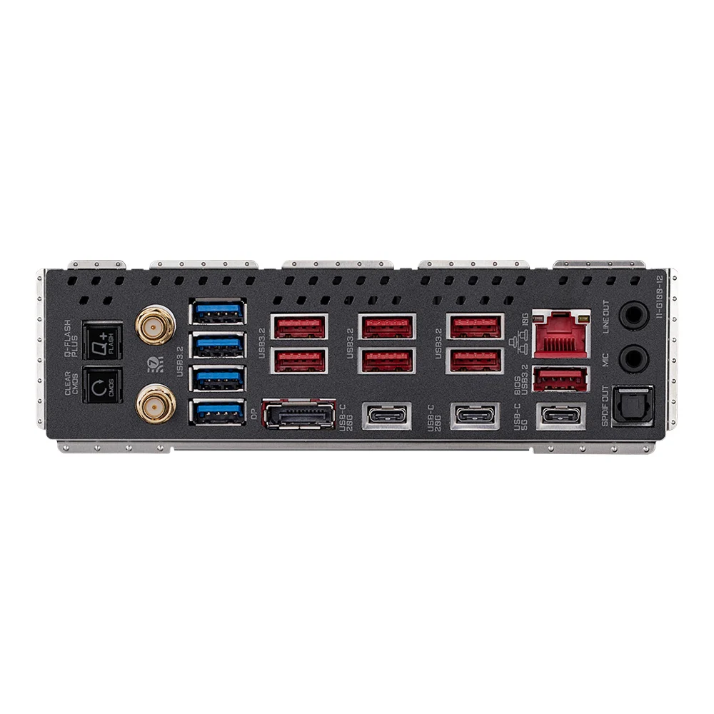 | Back Panel Connectors | 1 x Q-Flash Plus button 1 x Clear CMOS button 2 x SMA antenna connectors (2T2R) 1 x DisplayPort 1 x USB Type-C® port, with USB 3.2 Gen 1 support 2 x USB Type-C® ports, with USB 3.2 Gen 2×2 support 7 x USB 3.2 Gen 2 Type-A ports (red) 4 x USB 3.2 Gen 1 ports 1 x RJ-45 port 1 x optical S/PDIF Out connector 2 x audio jacks |